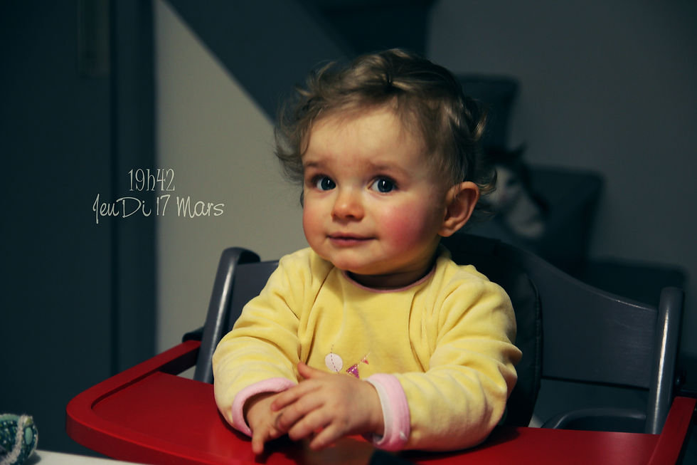 C'est fou comme parfois tes attitudes, tes manières font qu'on se rend compte que tu es de moins en moins un bébé, mais une petite fille... On vient de finir le repas, tu patientes sagement d'aller "au dodo", tes petits yeux nous font comprendre qu'il est temps d'aller dormir paisiblement... <3